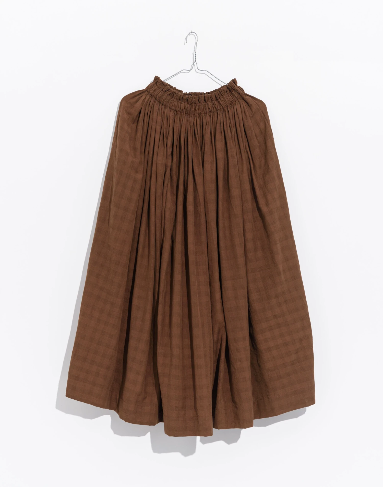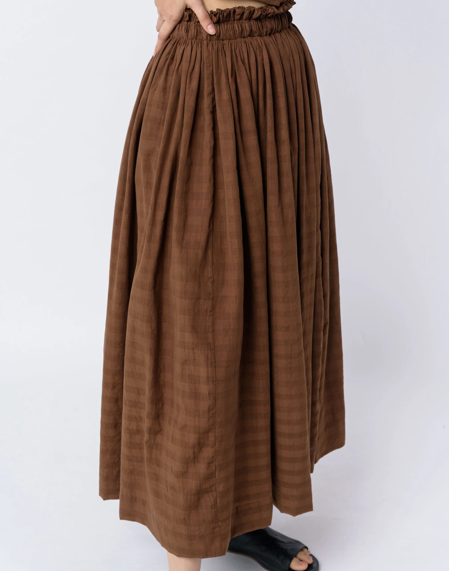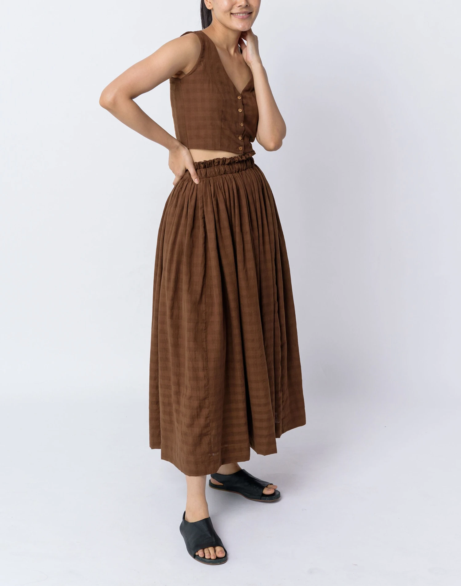 This contemporary Indian brand makes laid-back styles with an artisan twist that celebrate their cultural heritage. Toasted brown midi skirt is made from naturally textured organic cotton that adds rustic element to this chic piece. It has an elasticated waist for maximum comfort, smocking details, and minimal ruffles at the waistline. Its flowy hem falls at the mid-calf line. Style it with basic t-shirts or strappy tops for ease and enhancement. Â
