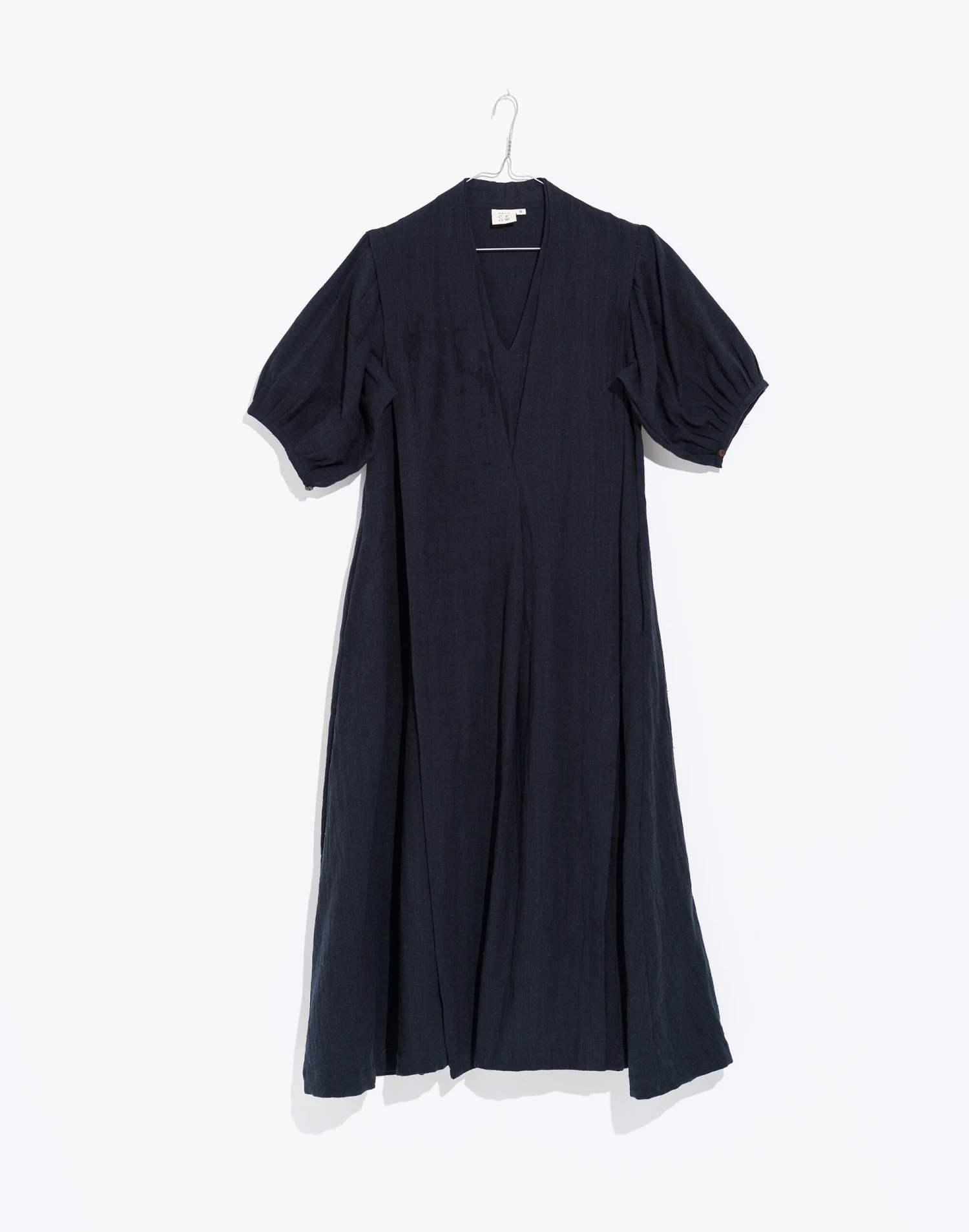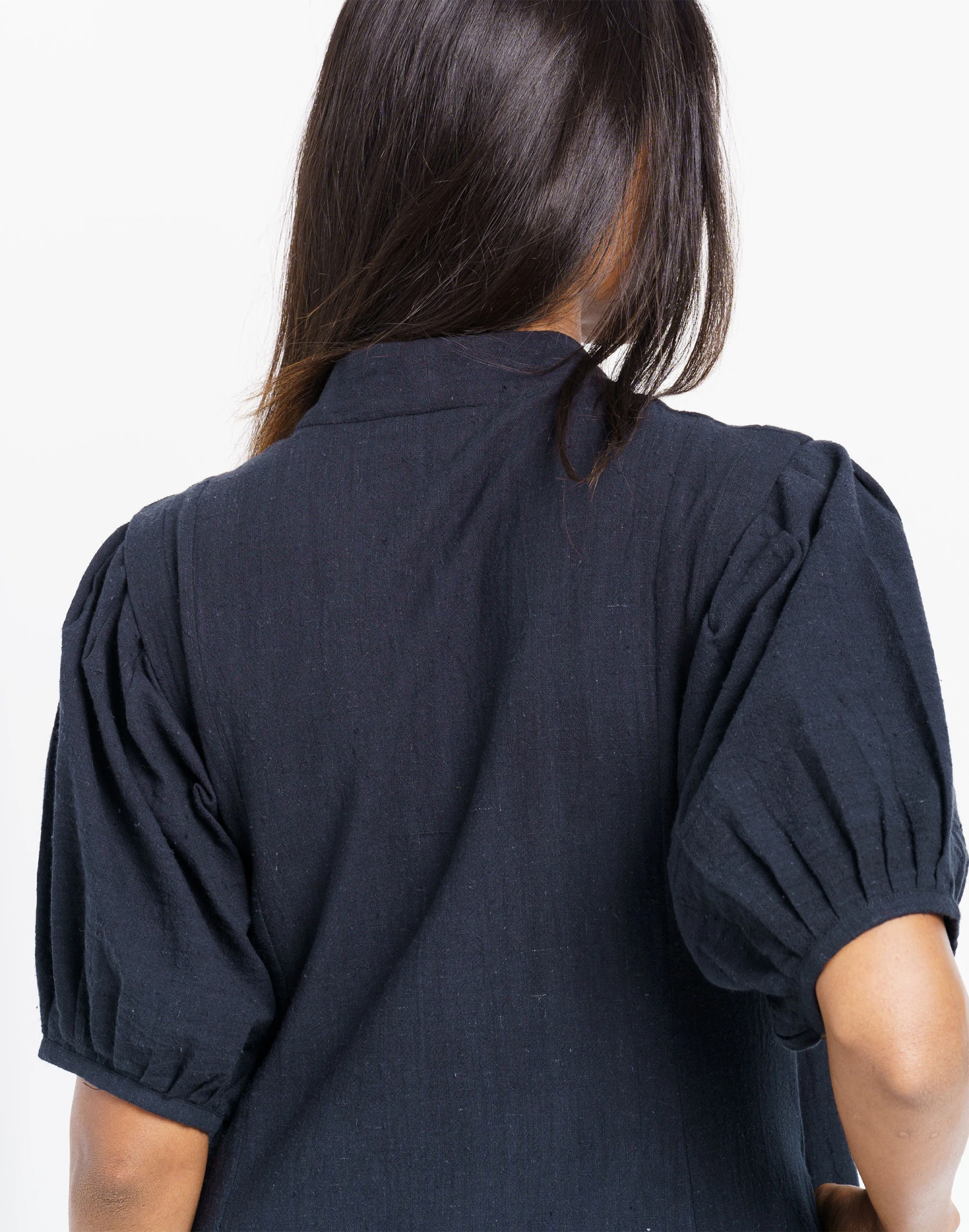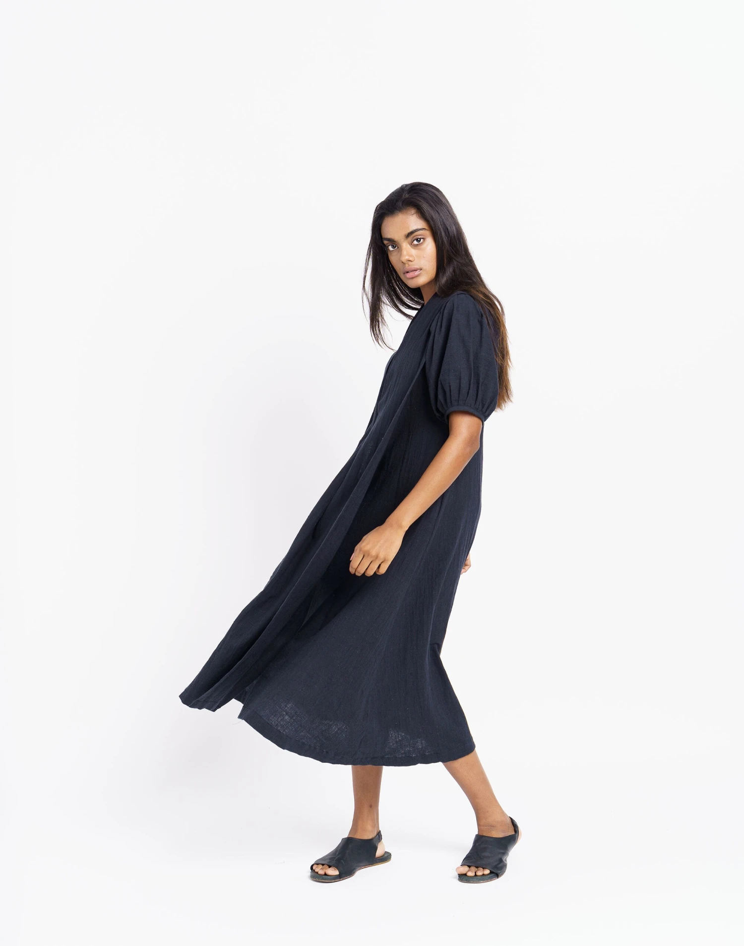 This contemporary Indian brand makes laid-back styles with an artisan twist that celebrate their cultural heritage. A classic ink black dress cut from planet-friendly organic & natural cotton fabric. Generously flared silhouette for everyday comfort, detailed with puffed sleeves to beautify the shoulder lines and freedom in movement. A striking piece for your desk to dinner plans. Â