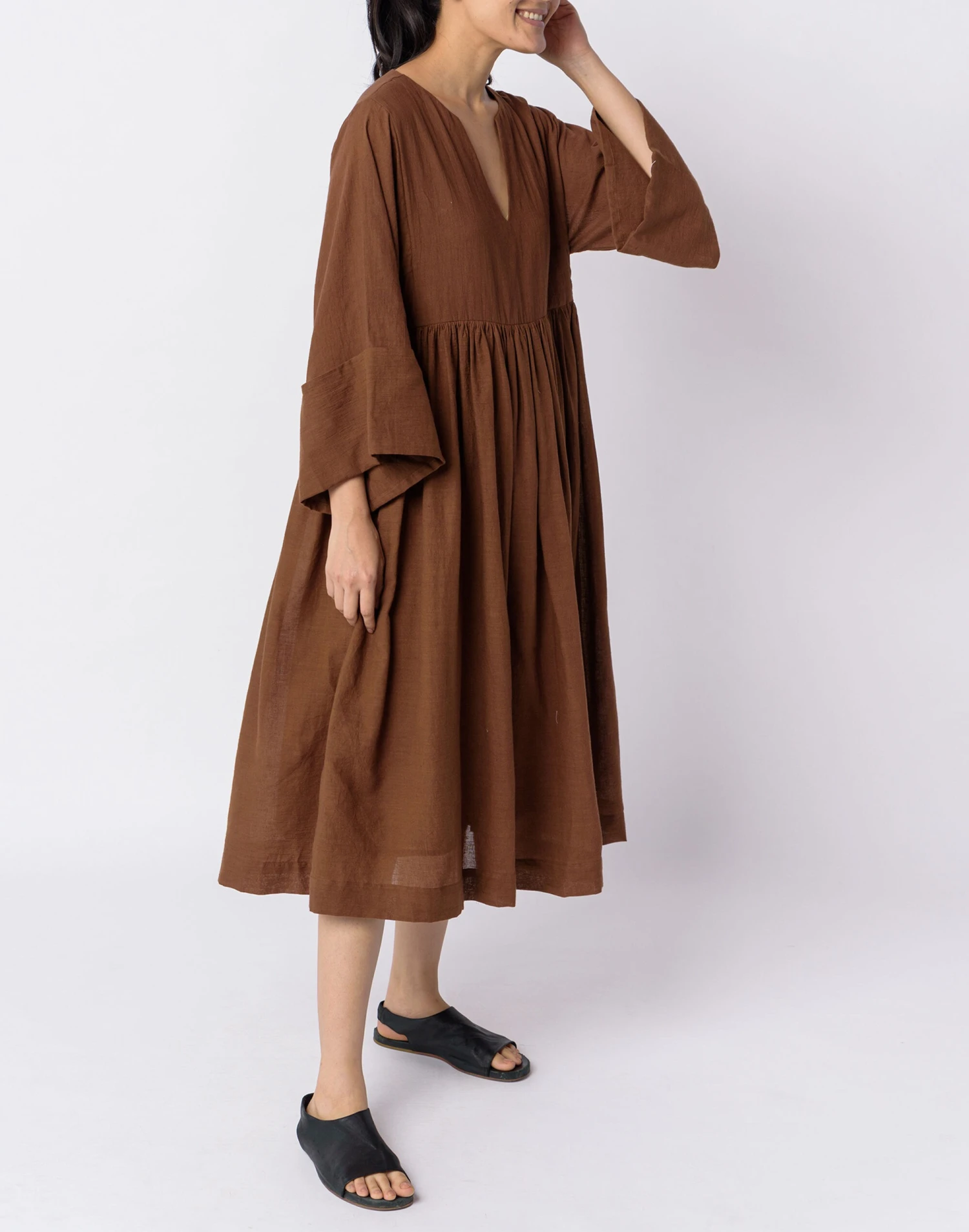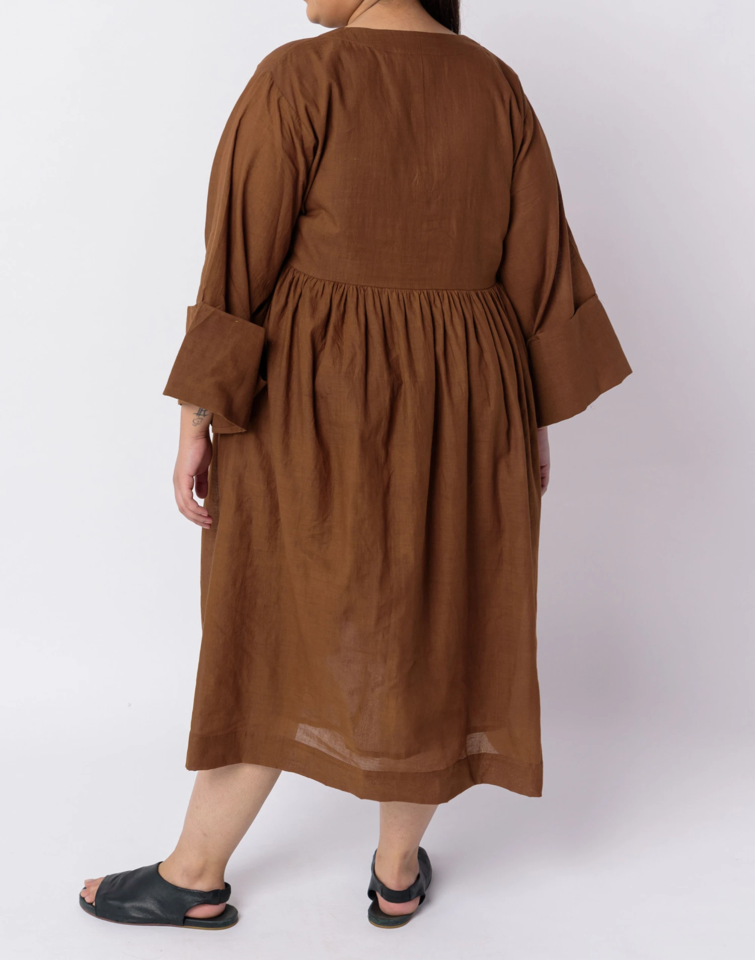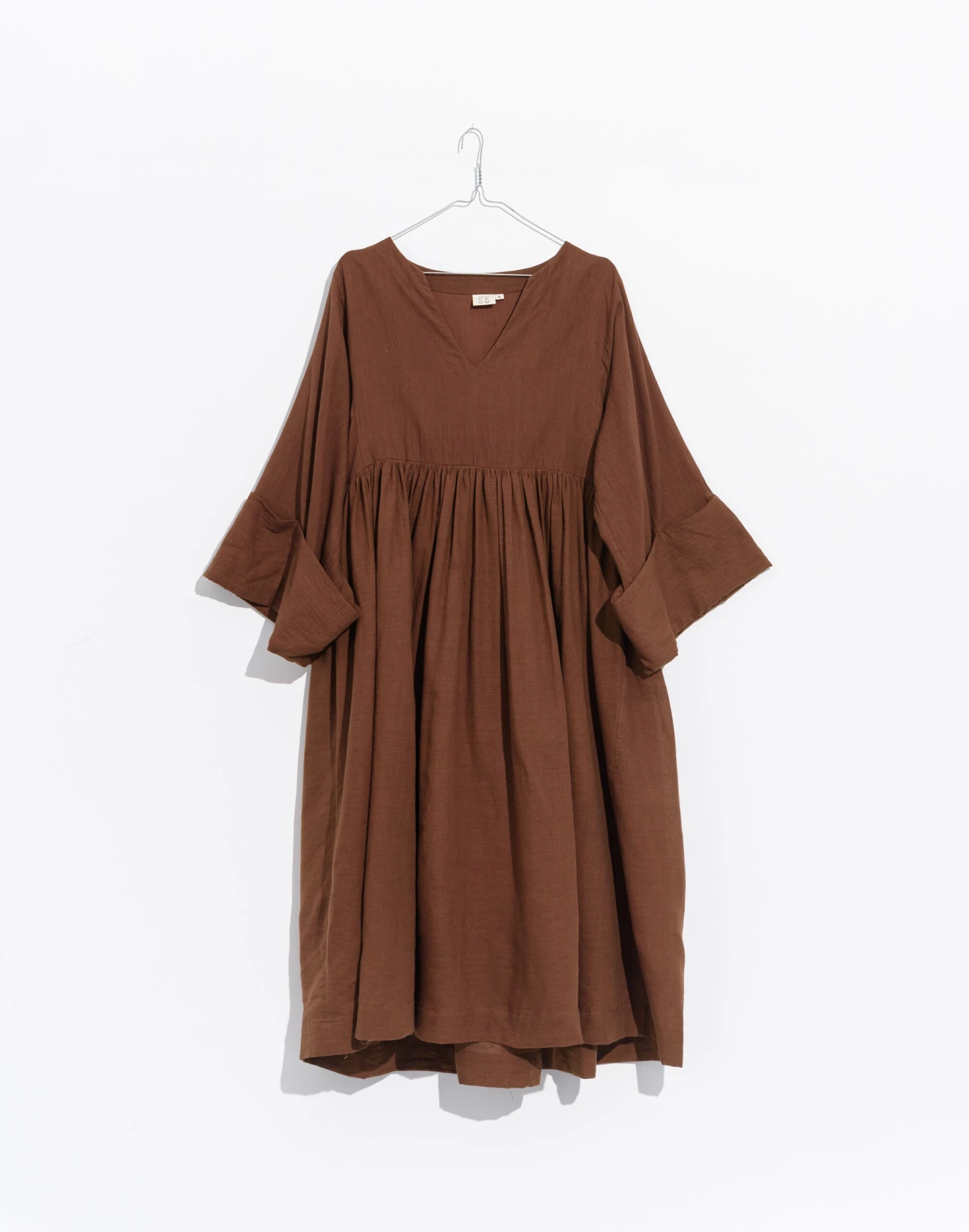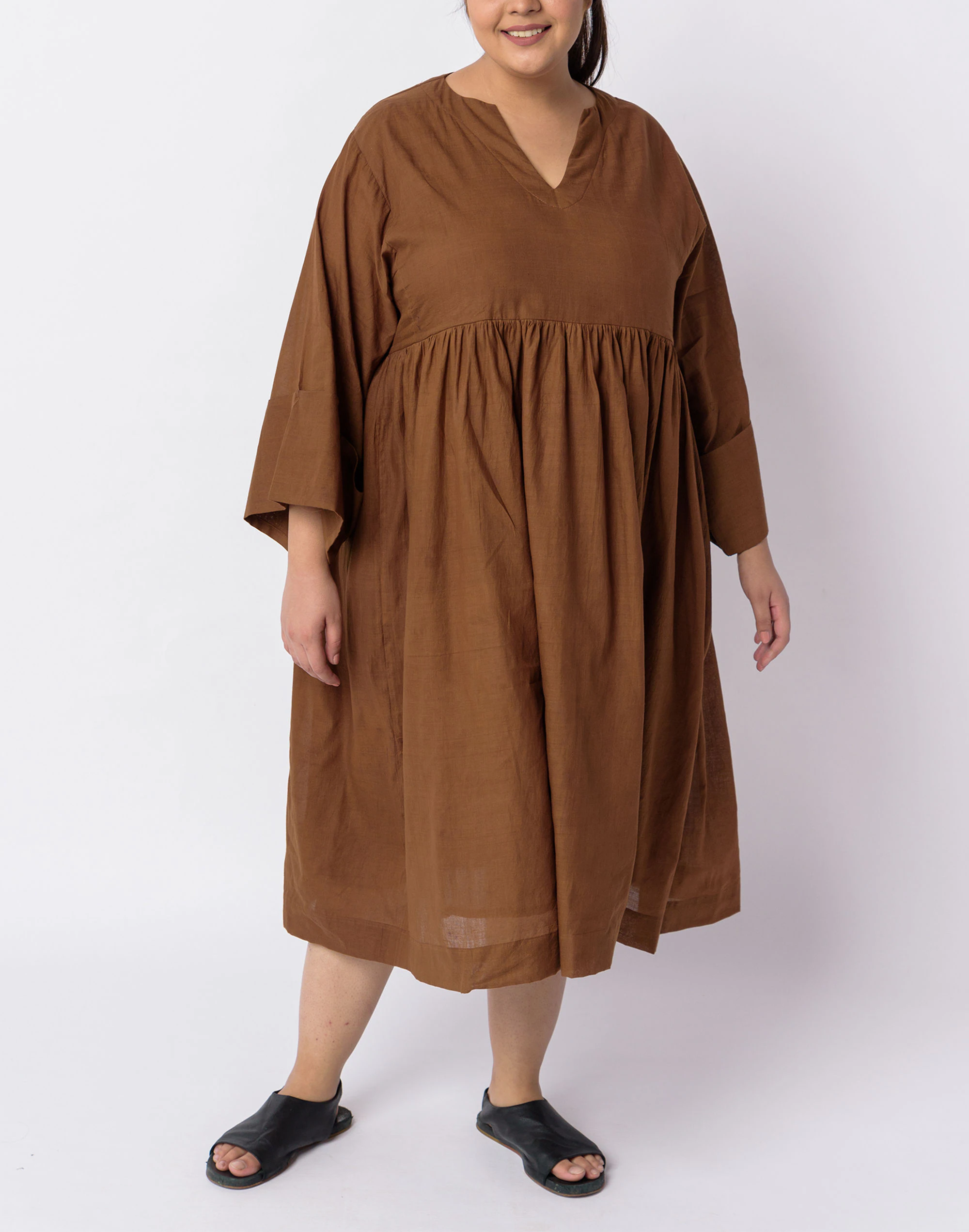 Founded in Ahmedabad, Gujarat, India by designer Shaila Khubchandani, World of Crow brings together contemporary style and traditional artisan-woven fabrics. This cocoa brown oversized dress is made with organic cotton handwoven by the artisans of western region of India. A versatile seasonless dress featuring delicate gathers at the waist to add shape to the boxy fit. This piece would work beautifully for transition weather and semi-formal looks. Â