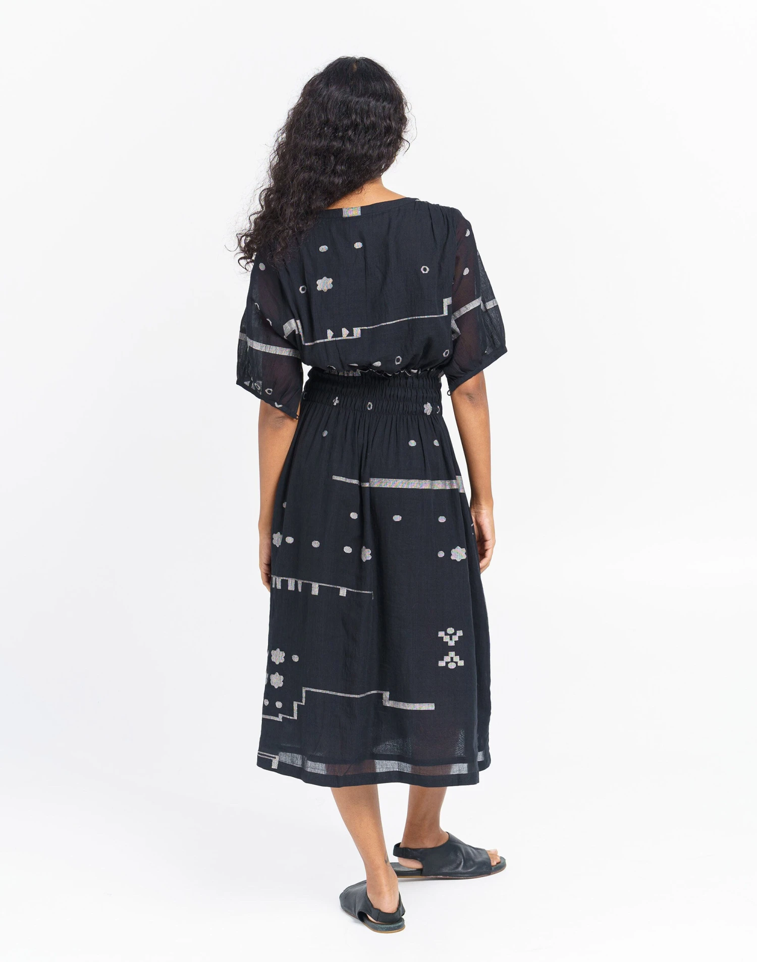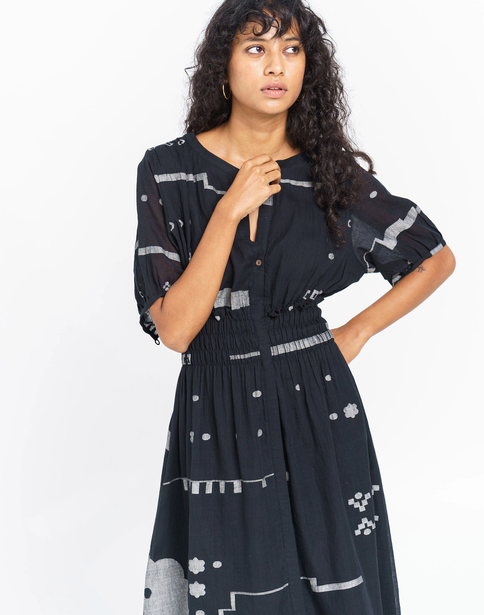 Founded in Ahmedabad, Gujarat, India by designer Shaila Khubchandani, World of Crow brings together contemporary style and traditional artisan-woven fabrics. This relaxed-fit dress has a round V-shaped neckline with button-down front enhanced with elasticated waist, short sleeves and inseam side pockets. You can style the dress for laid-back evenings, holidays or summer soirees.