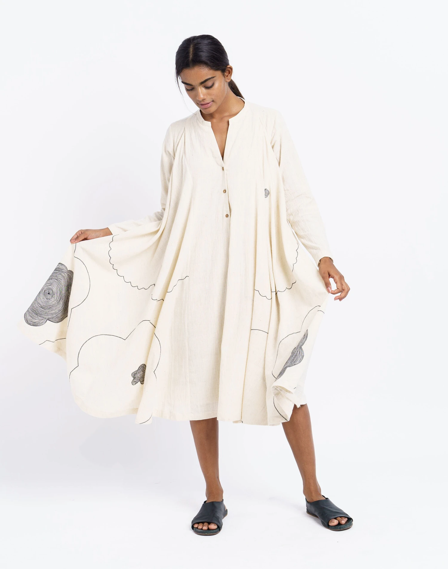 Founded in Ahmedabad, Gujarat, India by designer Shaila Khubchandani, World of Crow brings together contemporary style and traditional artisan-woven fabrics. Designed from soft & supple handwoven cotton fabric, this ivory midi-length scribble dress is tailored to fall loosely on the body. A lightweight staple is detailed with a round V-cut neckline, generous flare, long sleeves & button-down placket. The fit & feel of the dress is extremely approachable for an all-day wear, everyday comfort at w