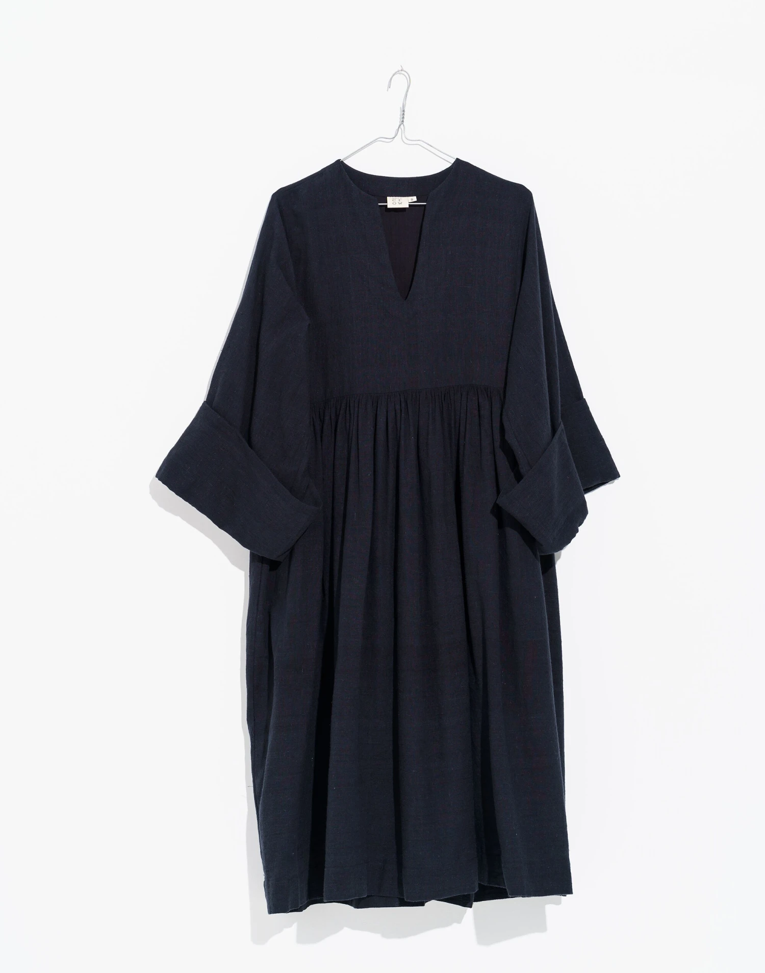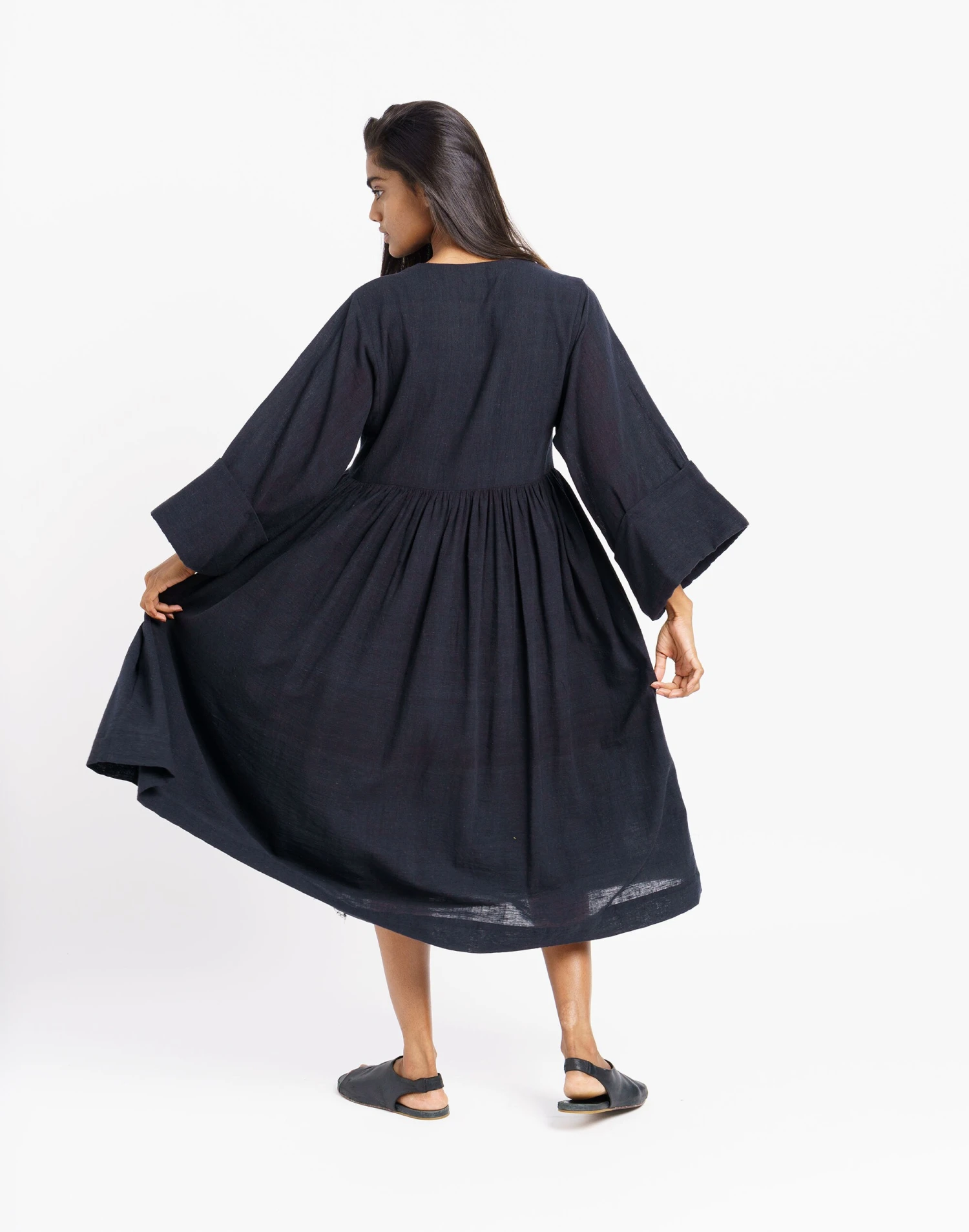 This contemporary Indian brand makes laid-back styles with an artisan twist that celebrate their cultural heritage. An ash black midi dress tailored from textured organic cotton fabric, handspun in India. A neat round V-neckline & boxy rolled up sleeves will add edge to your style. Designed for everyday wear, you would love to float into it with ease.