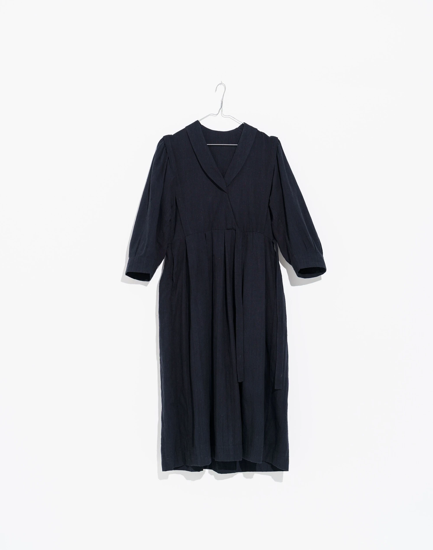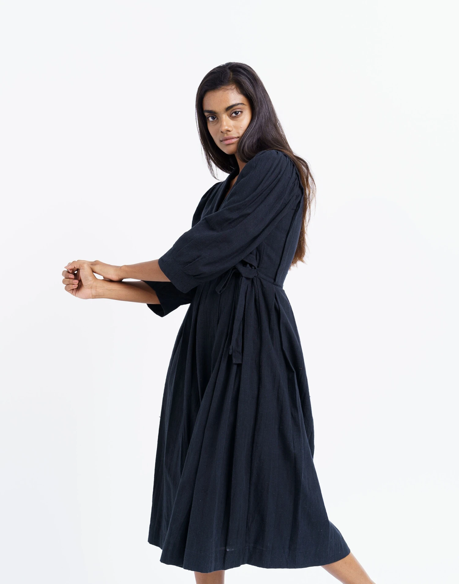 This contemporary Indian brand makes laid-back styles with an artisan twist that celebrate their cultural heritage. The vintage wrap-around pattern embodies elegance & luxury. Tailored from enriched natural organic fibers, this dress brings out your curves, defines your waistline & flatters all body shapes. Wide pleats at the waist & gathered puff sleeves are semi-formal details to make your style more approachable. Â