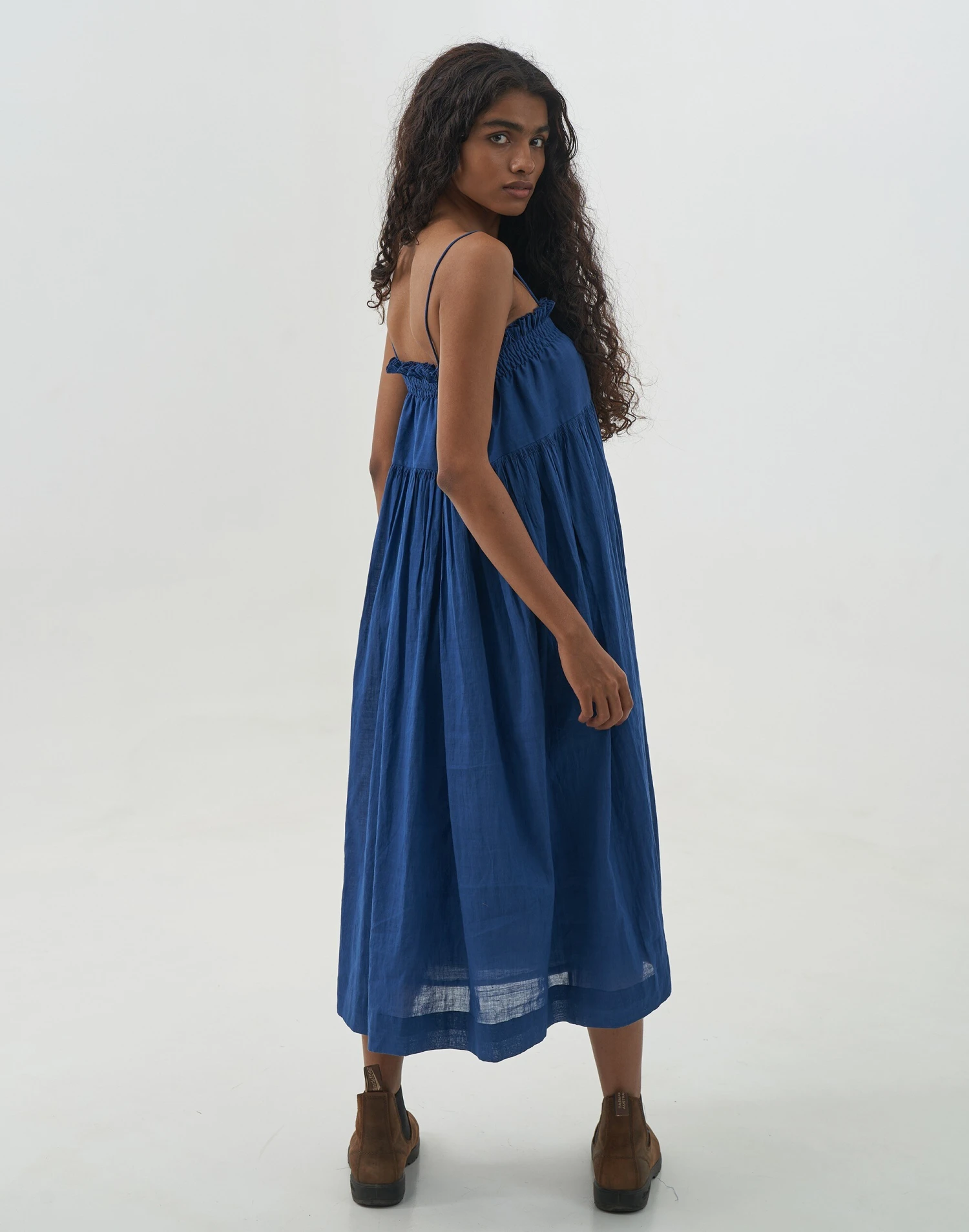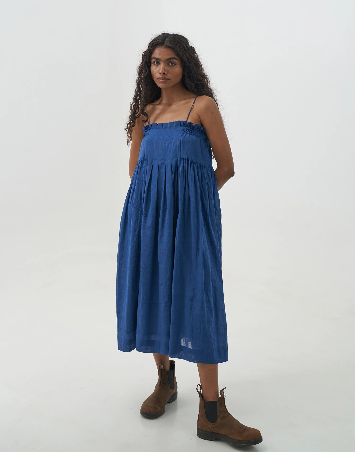 Founded in Ahmedabad, Gujarat, India by designer Shaila Khubchandani, World of Crow brings together contemporary style and traditional artisan-woven fabrics. The Midnight Blue Dress is a summer ready piece that combines a fun, classic silhouette with the finest cotton. Sporting dainty spaghetti straps, gathering at the chest, and a tiered flowy skirt, it’s a cute yet relaxed look.