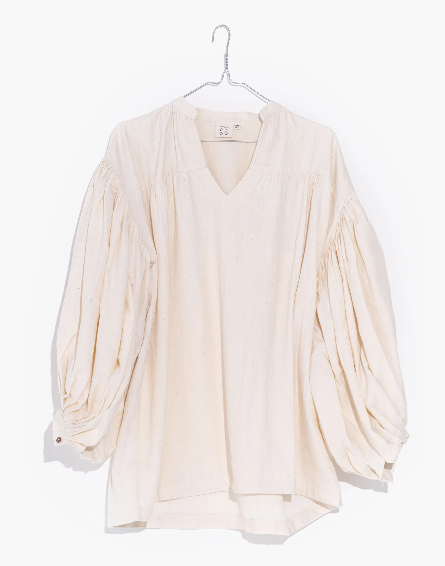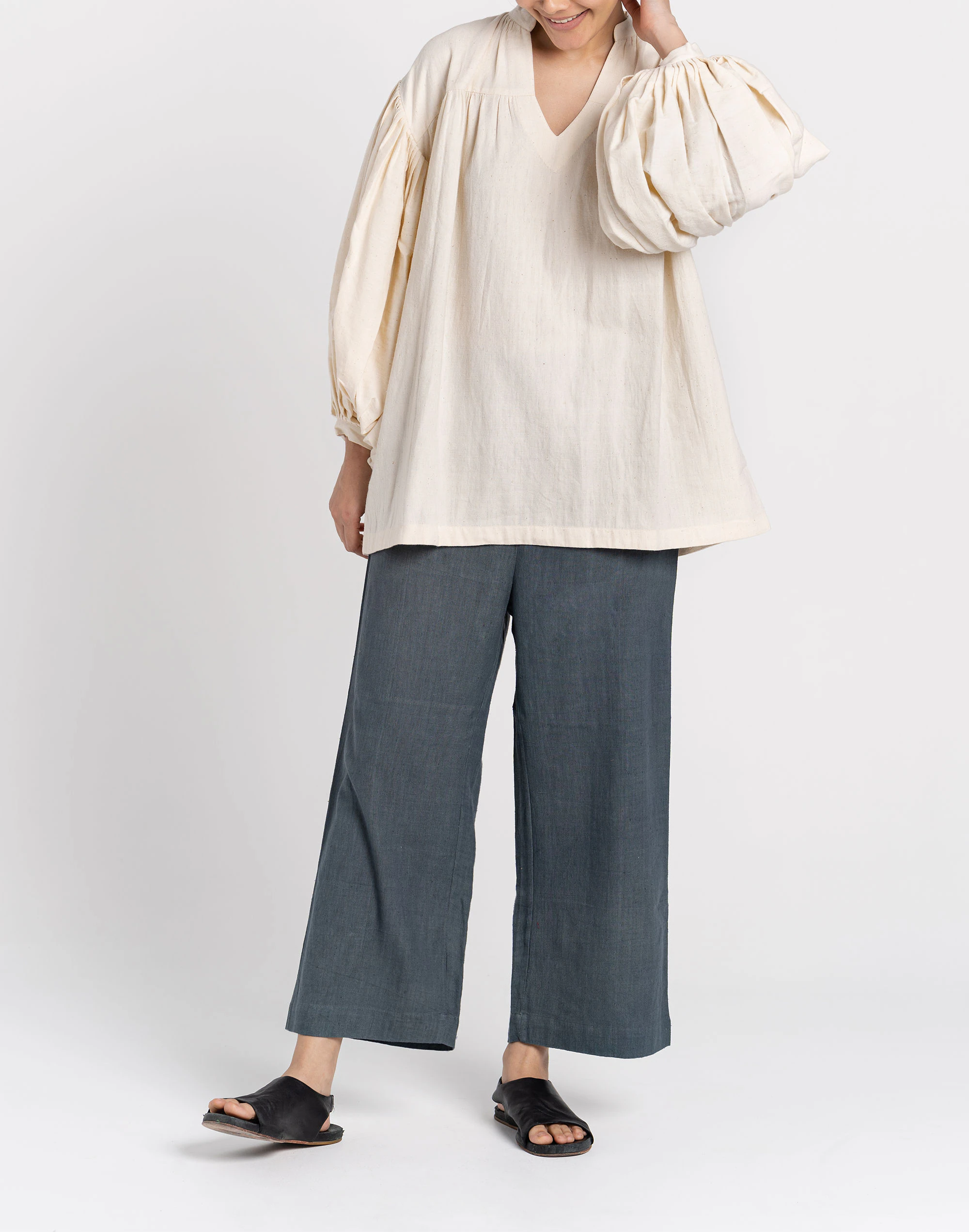 Founded in Ahmedabad, Gujarat, India by designer Shaila Khubchandani, World of Crow brings together contemporary style and traditional artisan-woven fabrics. This top is the perfect statement piece for those who have a classic sensibility. A natural ecru color, this longline top is soft, lightweight, and comfortable. It has a simple V-shaped neckline and long sleeves. The placket in front is slightly gathered to create a flattering silhouette while still maintaining the longline shape.