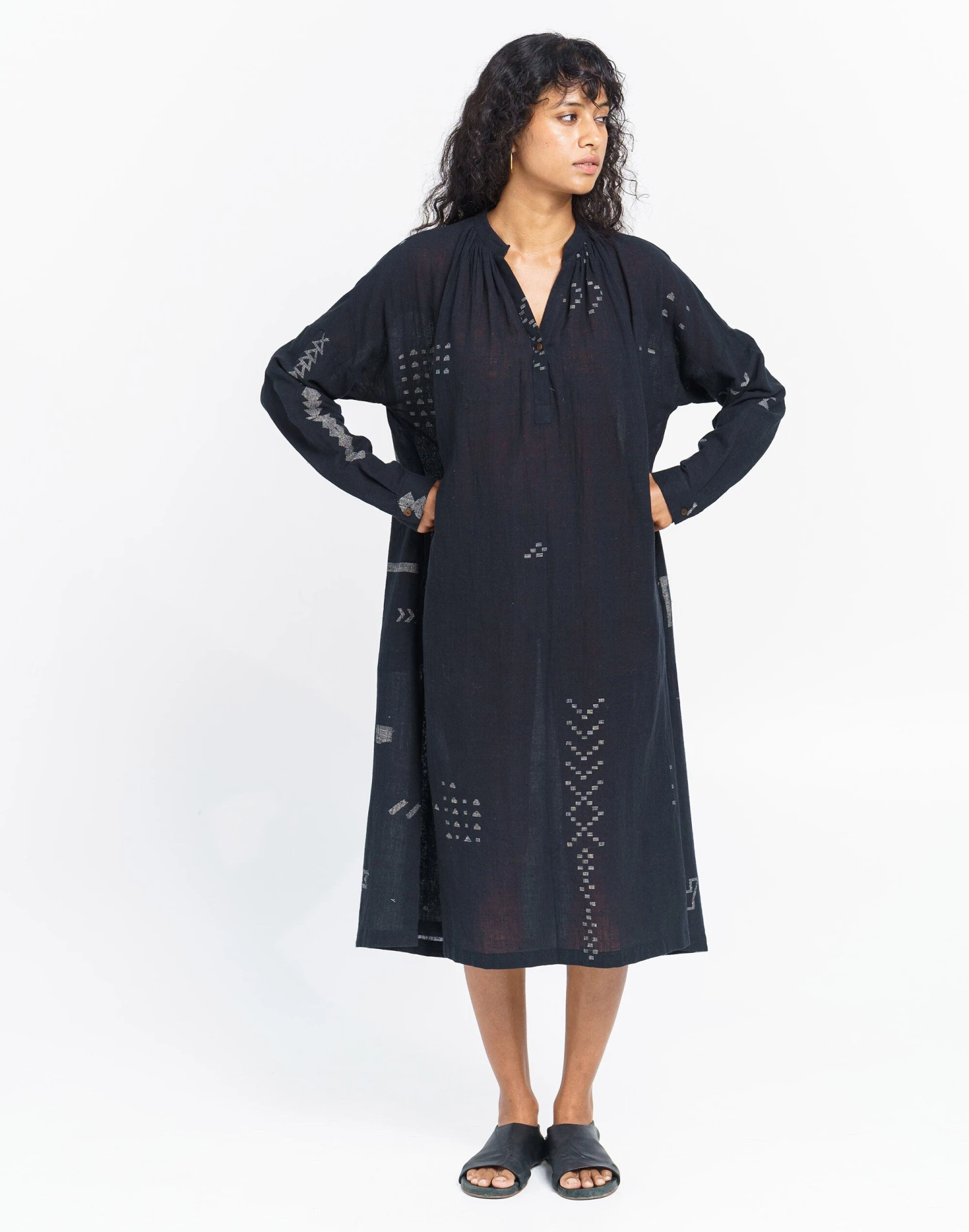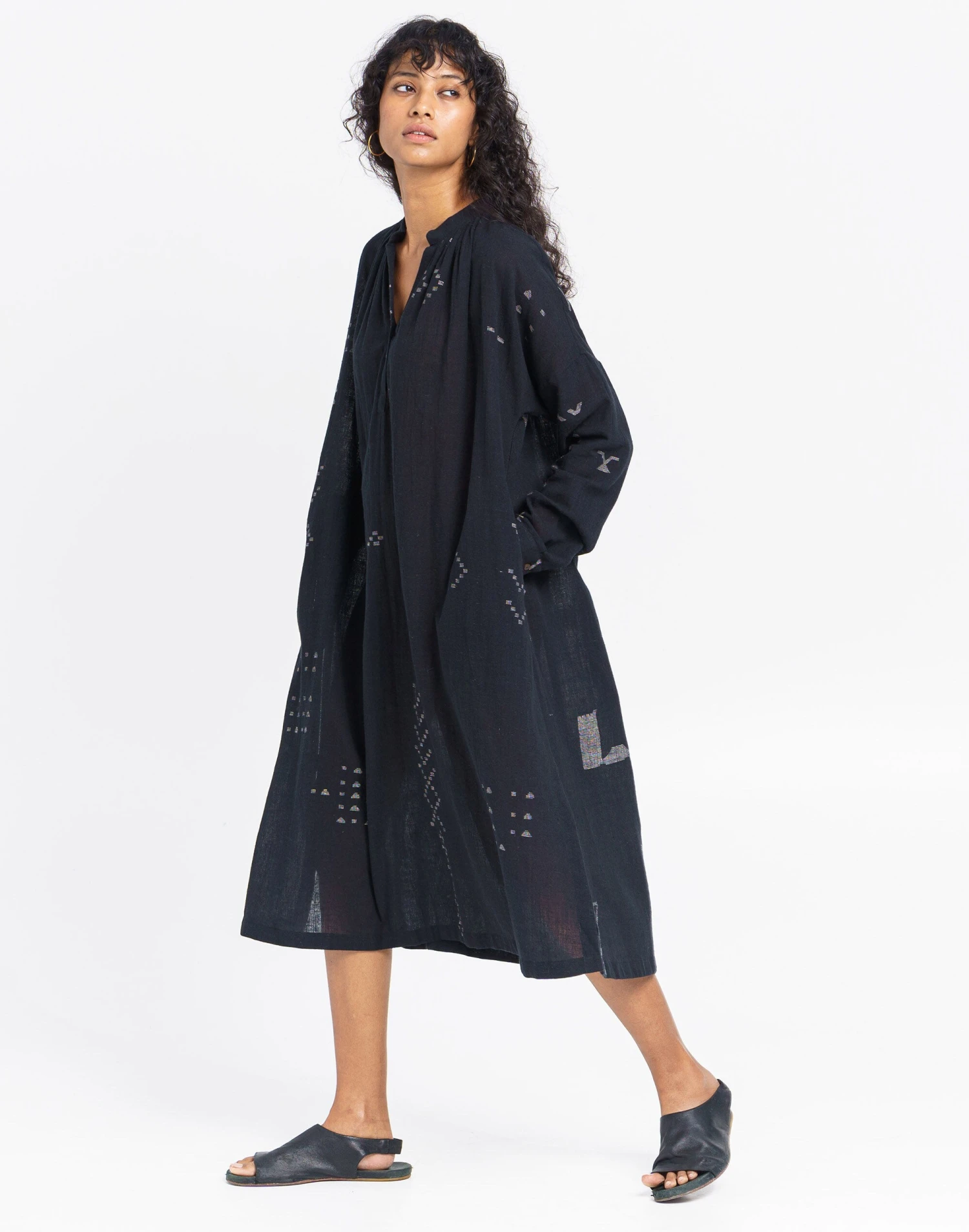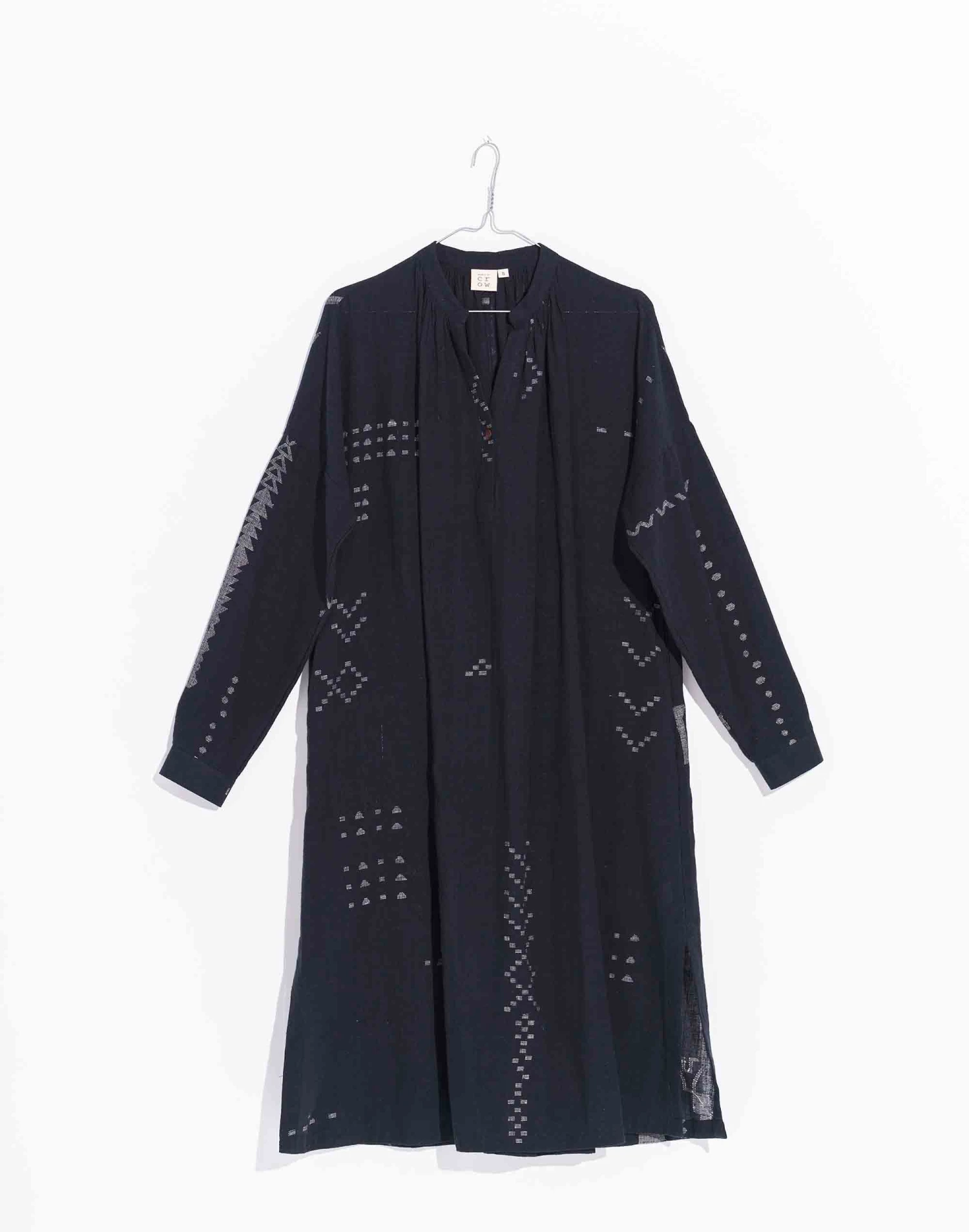 Founded in Ahmedabad, Gujarat, India by designer Shaila Khubchandani, World of Crow brings together contemporary style and traditional artisan-woven fabrics. Designed for an oversized fit, this calf-length dress is cut from a beautiful hand-detailed cotton fabric with woven tribal motifs made by talented weavers of India. It features a free-flowing cut and a relaxed stand collar neck framed with playful gentle gathers. Its relaxed full sleeves taper at the wrist with cuff closure. An ideal pick