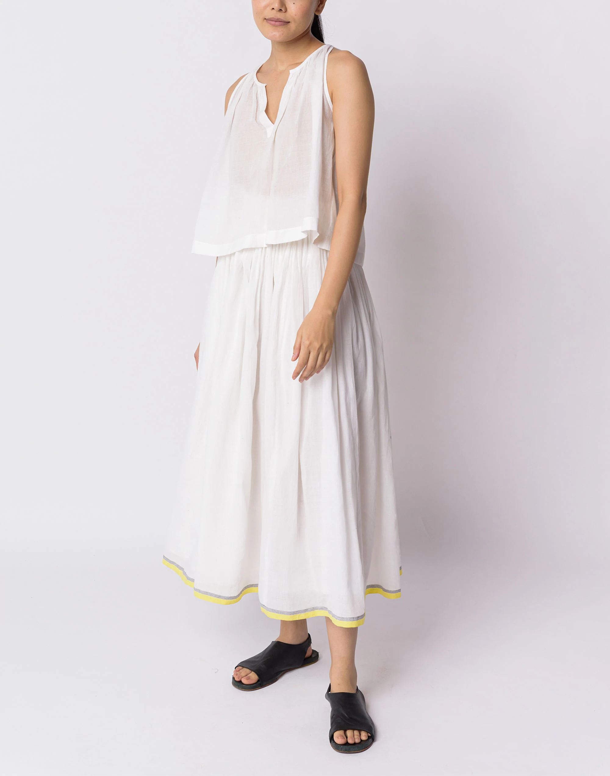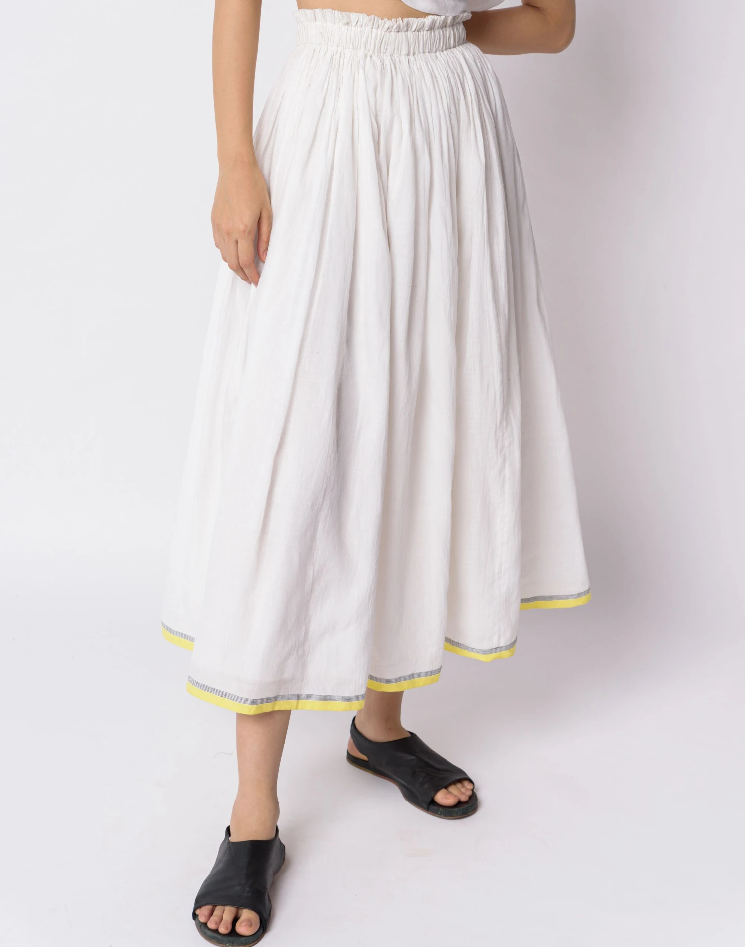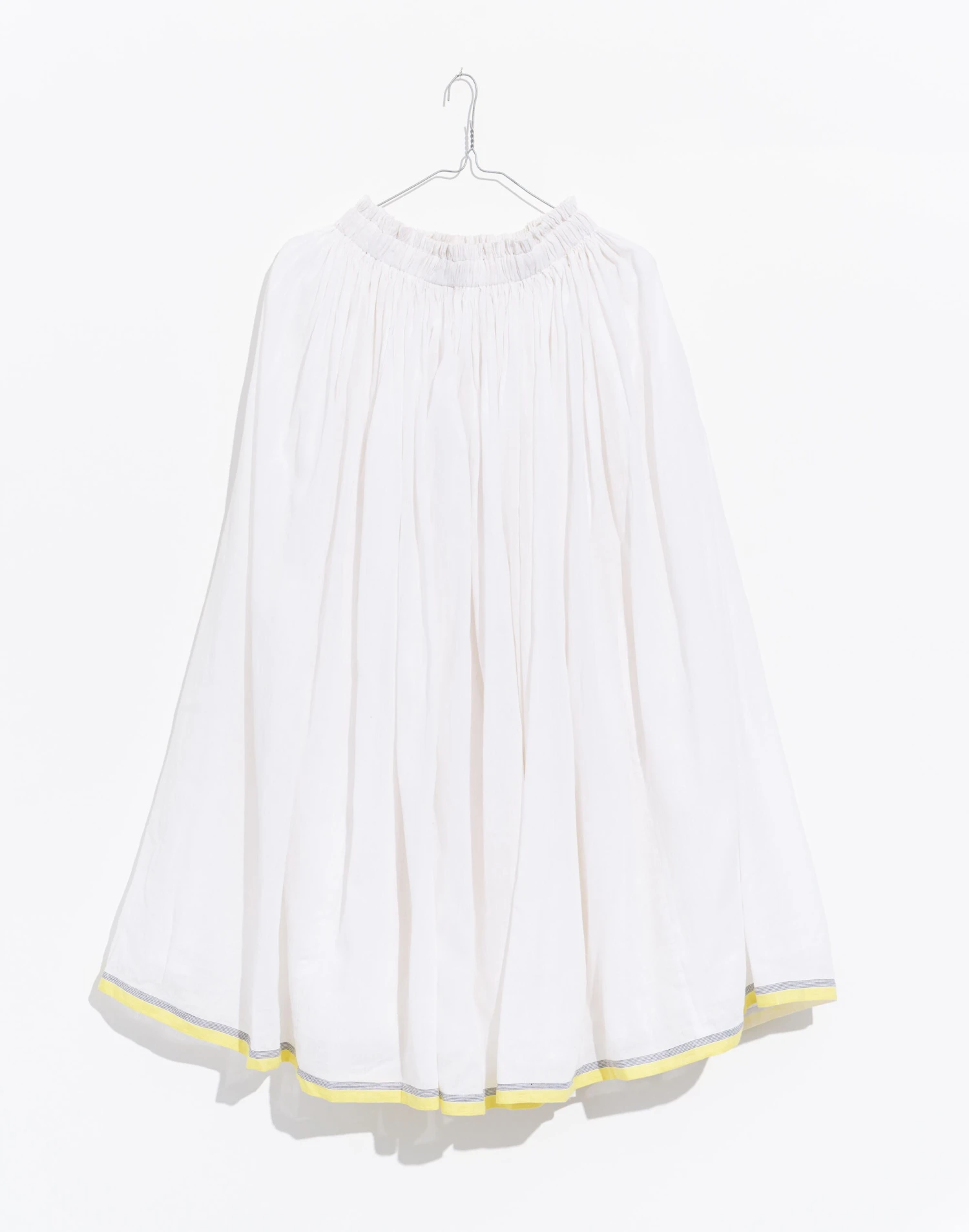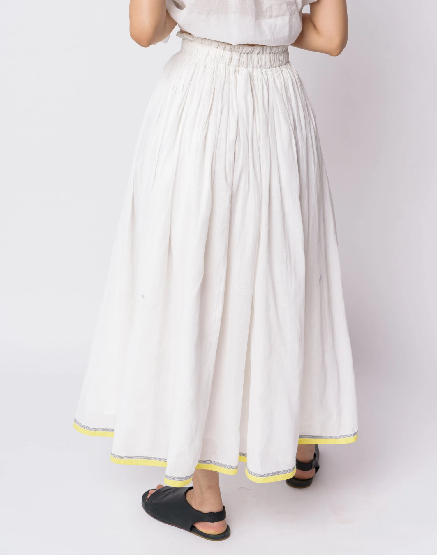 This contemporary Indian brand makes laid-back styles with an artisan twist that celebrate their cultural heritage. A very simple yet chic piece made with 100% handwoven cotton from India. The pearl white color with yellow selvedge makes it a charming choice for the outdoorsy day looks. The silhouette makes it very comfortable for all seasons. The smocked elasticated waist with beautifully falling gathers creates this overall dignified outfit. This can be paired with multiple classics and can make for a gre