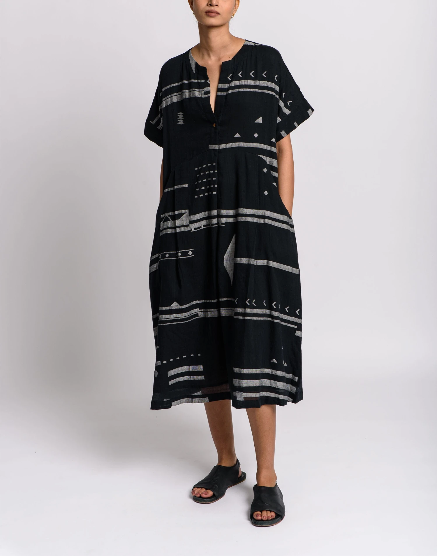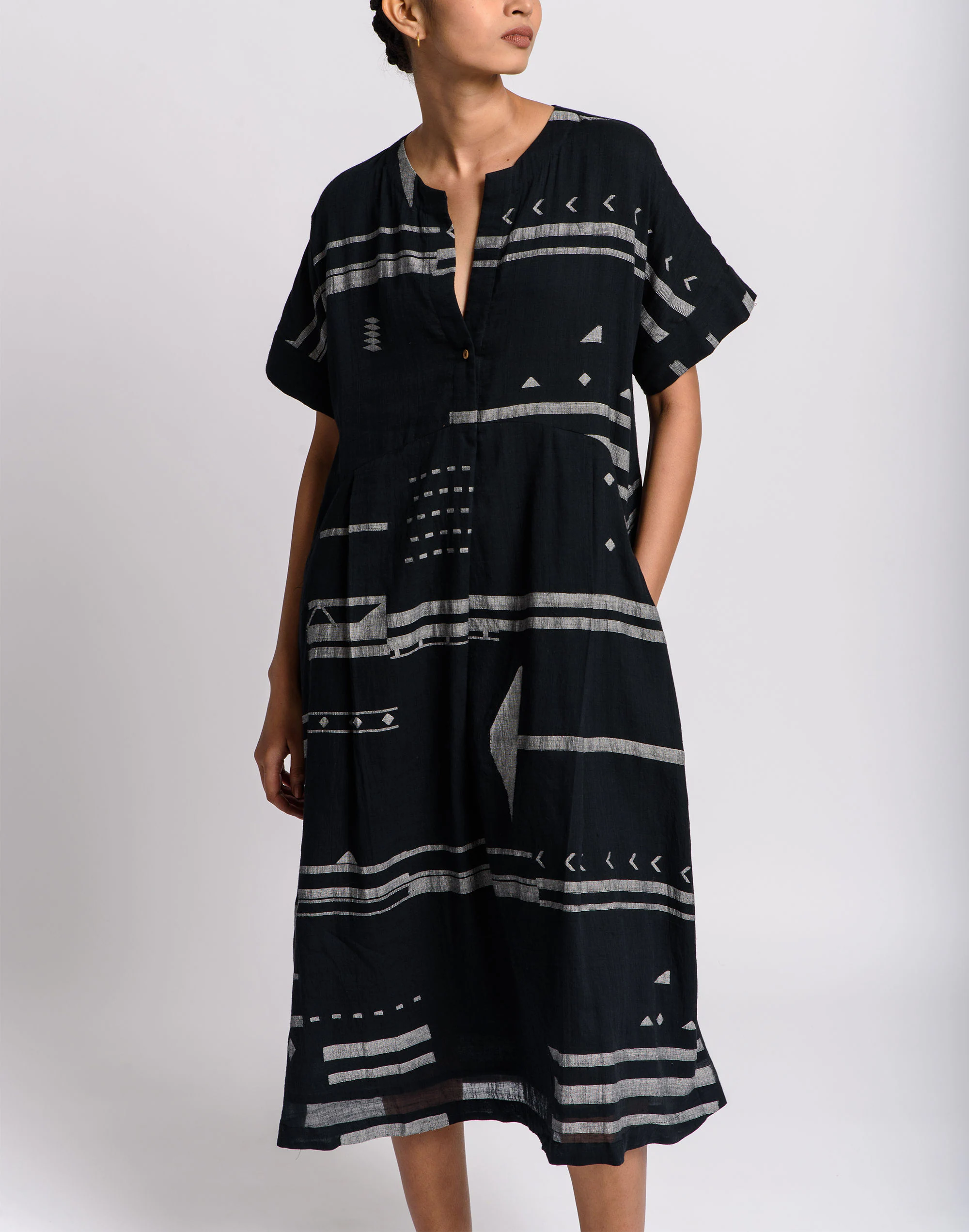Founded in Ahmedabad, Gujarat, India by designer Shaila Khubchandani, World of Crow brings together contemporary style and traditional artisan-woven fabrics. The perfect shift dress for a woman with a bold yet elegant sense of style. This dress is made using the finest jamdani fabric handwoven by the weavers of India. Iconic in its appeal, this piece takes us back to the 1800s where European geometric art was introduced to the world. You can wear it to your next formal gathering or as a casual outfit for di
