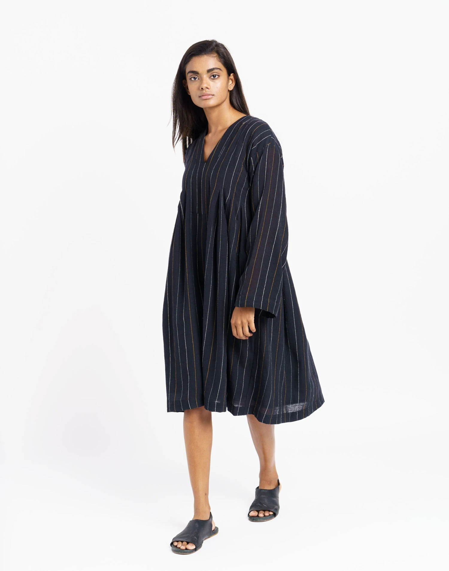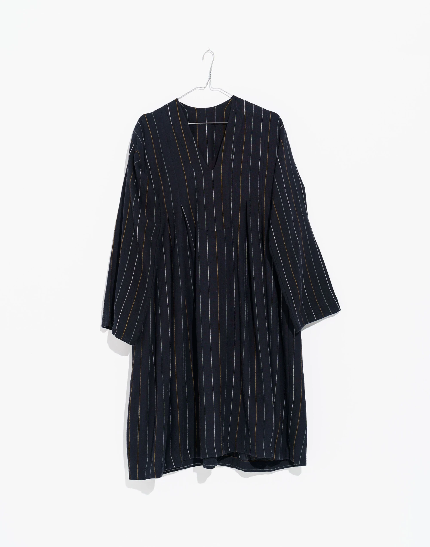 This contemporary Indian brand makes laid-back styles with an artisan twist that celebrate their cultural heritage. Tailored from textured handwoven cotton utilizing traditional processes to produce a delicate stripe design. This relaxed fit dress raises the bar for simple versatility & is an adaptable cold-weather staple. It features a sleek V-shaped neckline, long boxy sleeves and pleated empire waist.