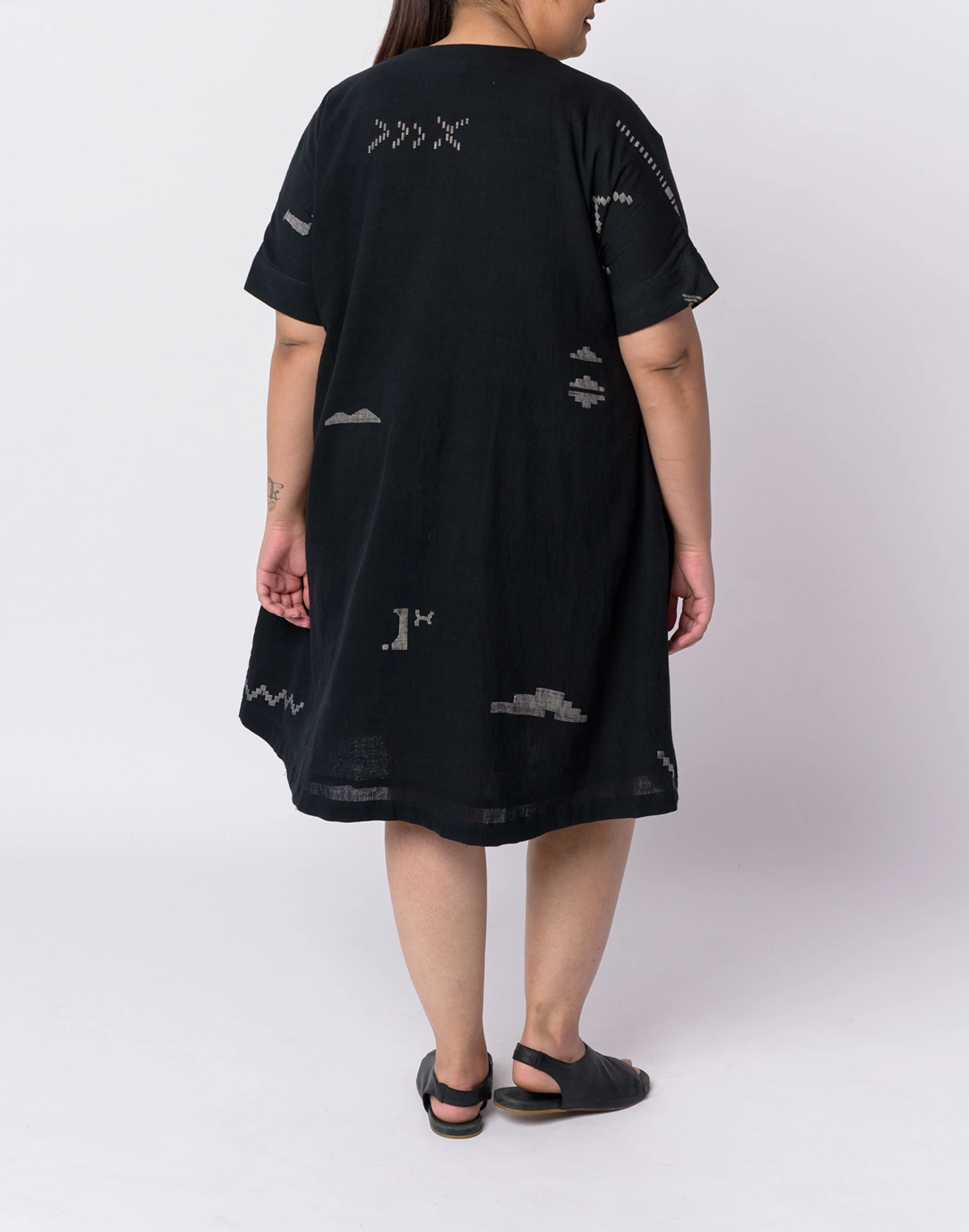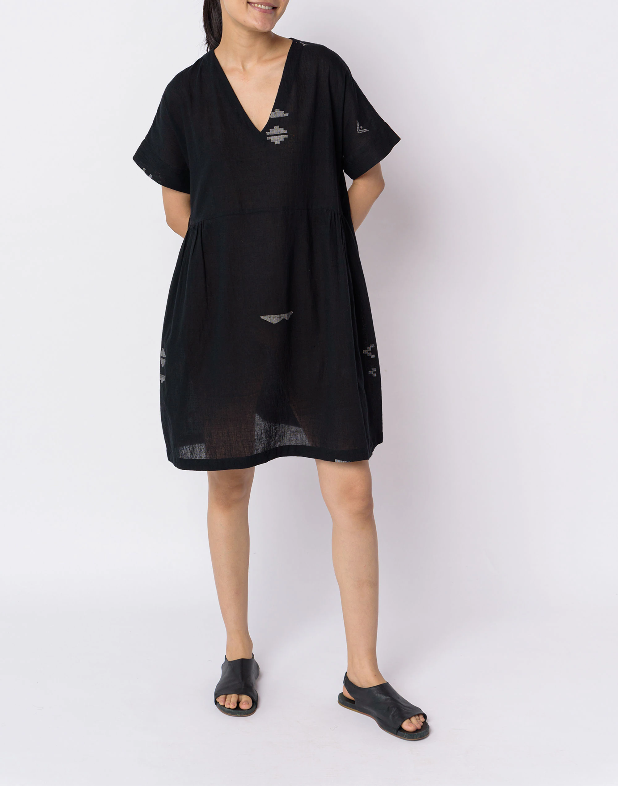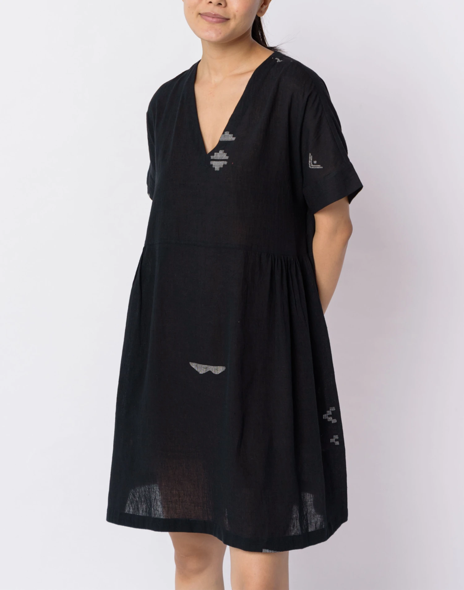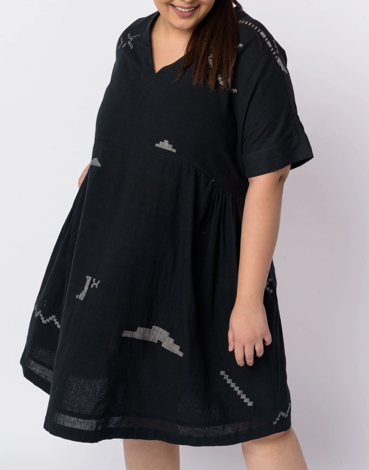 Founded in Ahmedabad, Gujarat, India by designer Shaila Khubchandani, World of Crow brings together contemporary style and traditional artisan-woven fabrics. A sleek and chic dress that works perfectly for all day comfort as well as evening outings. The monochromatic colors add depth and feel to the simple structure of the dress. Gently gathered around the waist, this dress is designed for enhanced movement and comfort. Â
