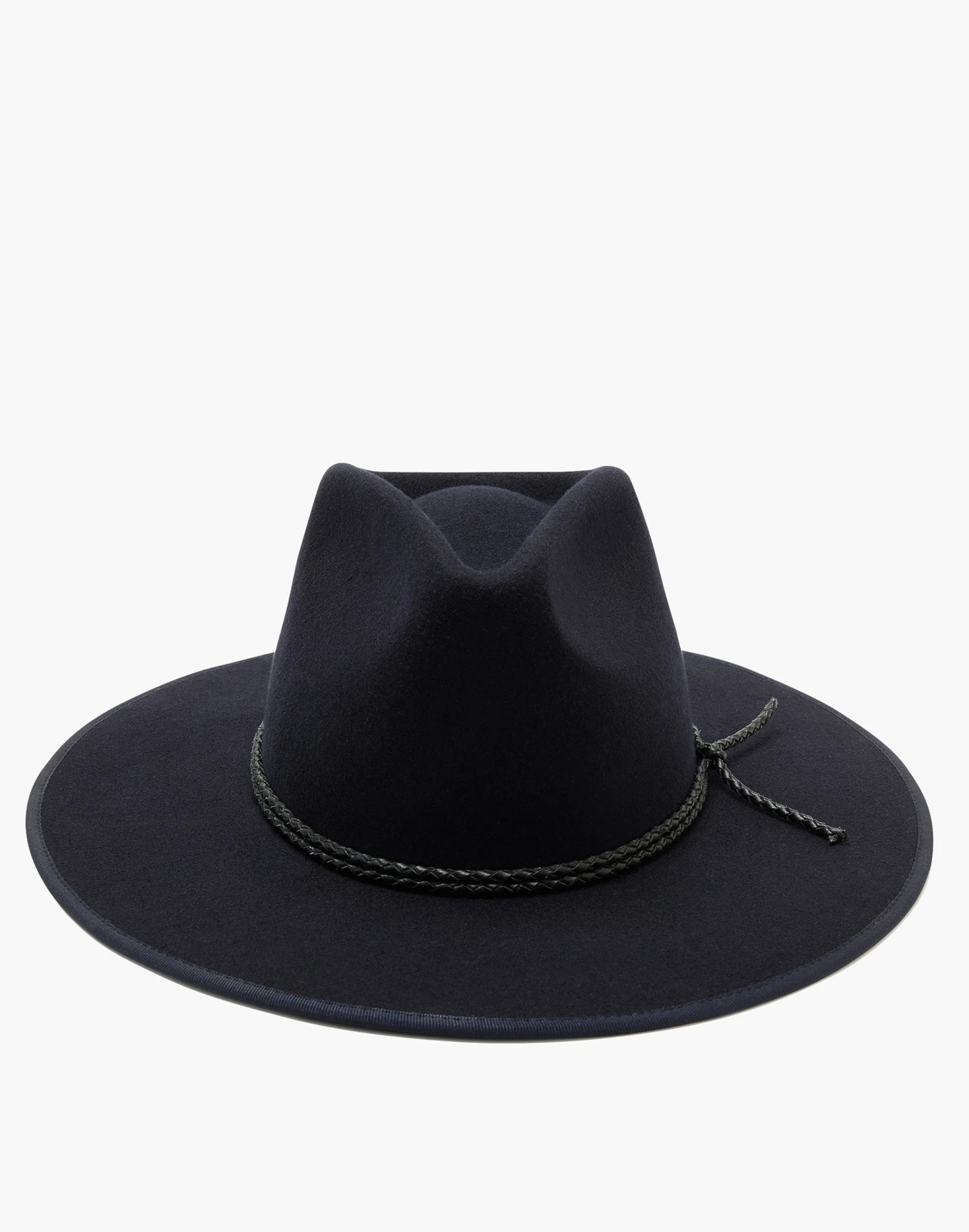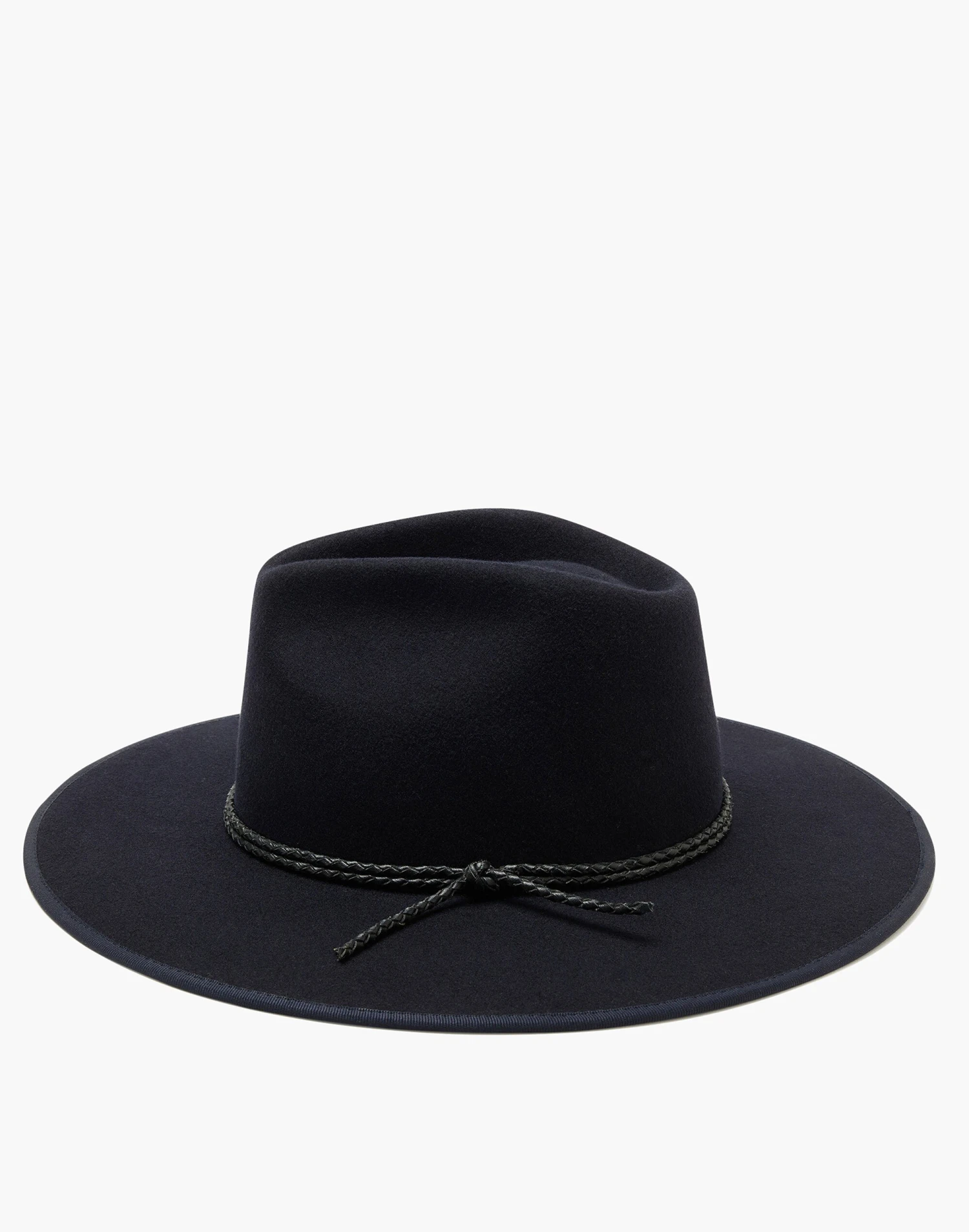 Designed in California by husband and wife duo Michael Hagen and Hedda Staines, WYETH is devoted to best-of-the-best headgear. Walker is an Australian wool felt fedora that features a flat wide brim, pinched crown, braided rope trim & ribbon trimmed brim. Â