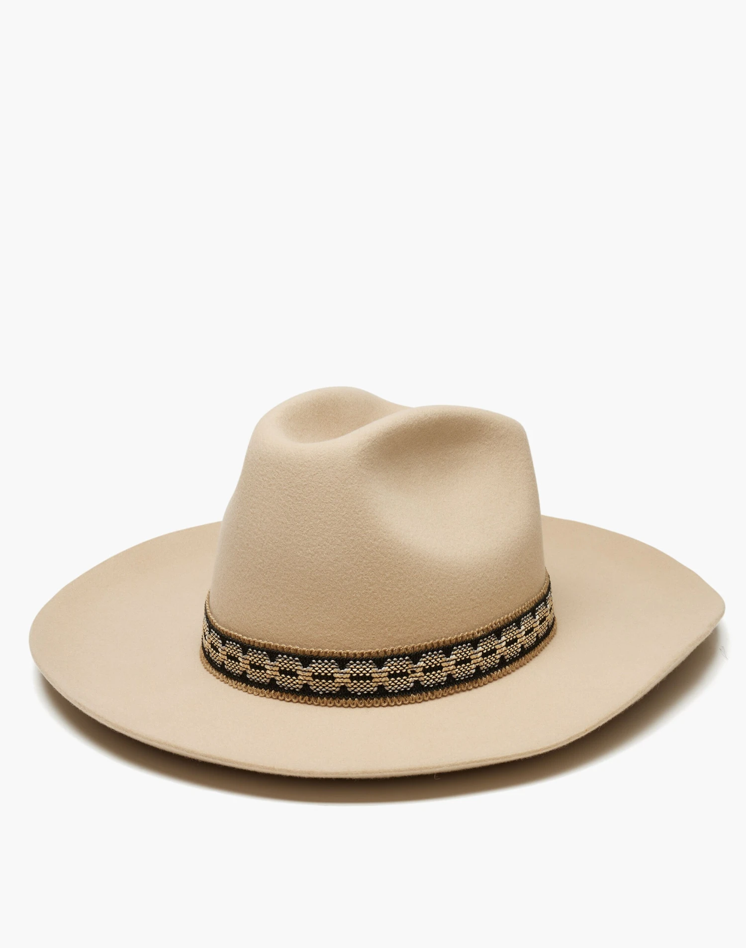 Designed in California by husband and wife duo Michael Hagen and Hedda Staines, WYETH is devoted to best-of-the-best headgear. This high crown cowboy hat is made of 100% Australian wool and features a woven western print trim. Bonus: You can customize the fit using the size adjuster hidden in the sweatband under the label.